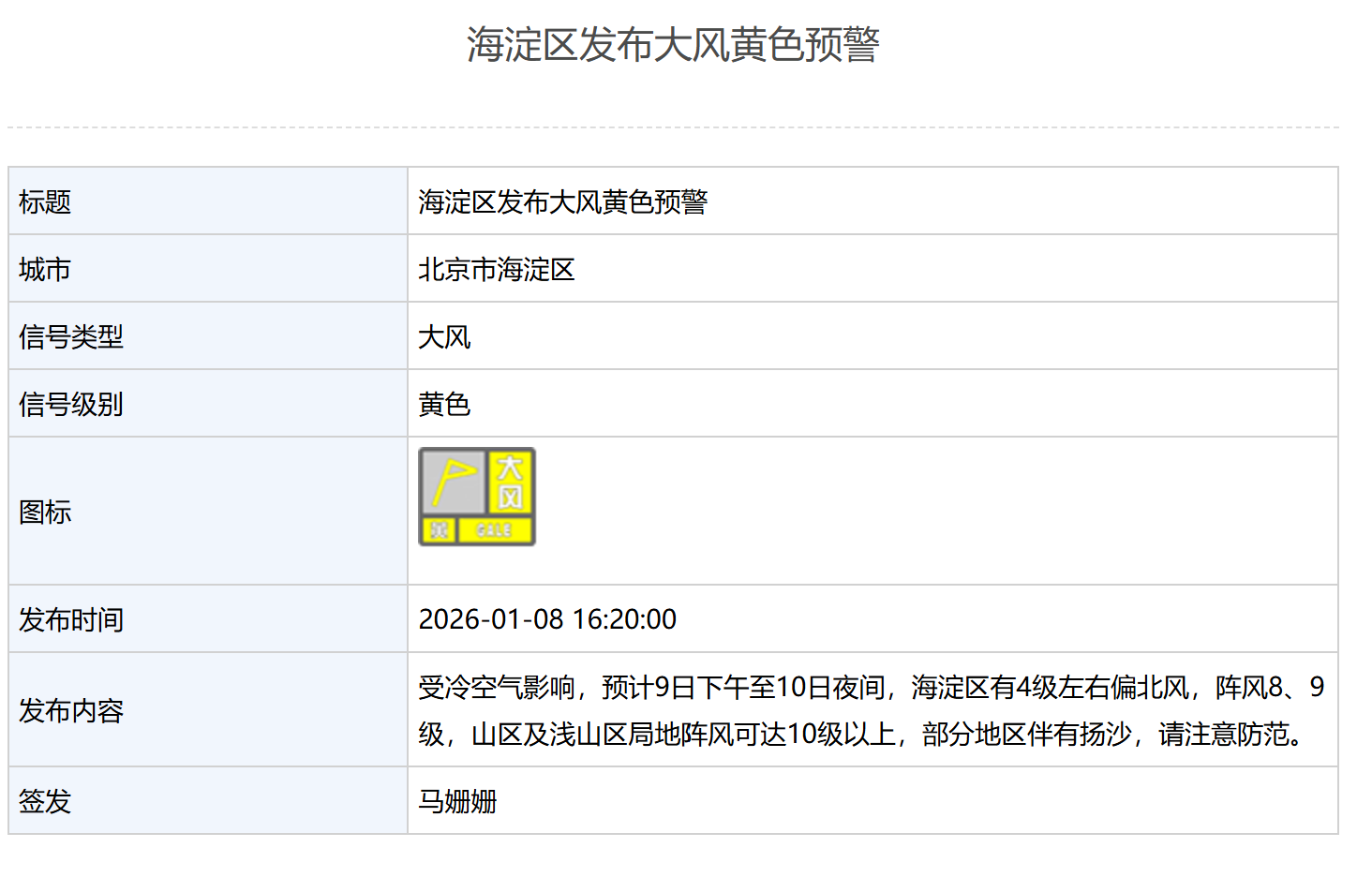 海淀区发布大风黄色预警:受冷空气影响,预计9日下午至10日夜间,海淀区有4级左右偏北风,阵风8、9级,山区及浅山区局地阵风可达10级以上,部分地区伴有扬沙,请注意防范。