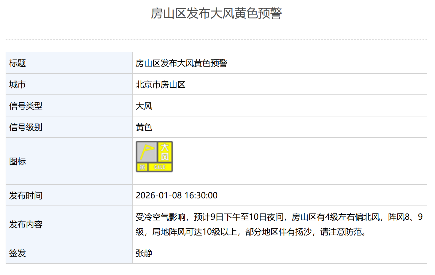 房山区发布大风黄色预警:受冷空气影响,预计9日下午至10日夜间,房山区有4级左右偏北风,阵风8、9级,局地阵风可达10级以上,部分地区伴有扬沙,请注意防范。