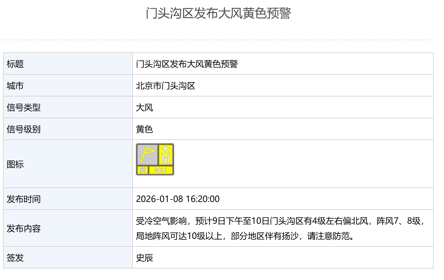 门头沟区发布大风黄色预警:受冷空气影响,预计9日下午至10日门头沟区有4级左右偏北风,阵风7、8级,局地阵风可达10级以上,部分地区伴有扬沙,请注意防范。