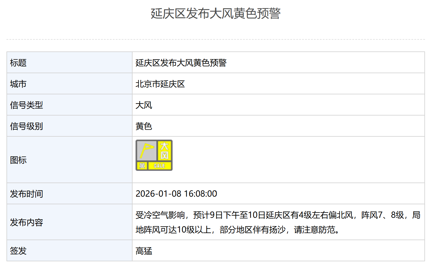 延庆区发布大风黄色预警:受冷空气影响,预计9日下午至10日延庆区有4级左右偏北风,阵风7、8级,局地阵风可达10级以上,部分地区伴有扬沙,请注意防范。