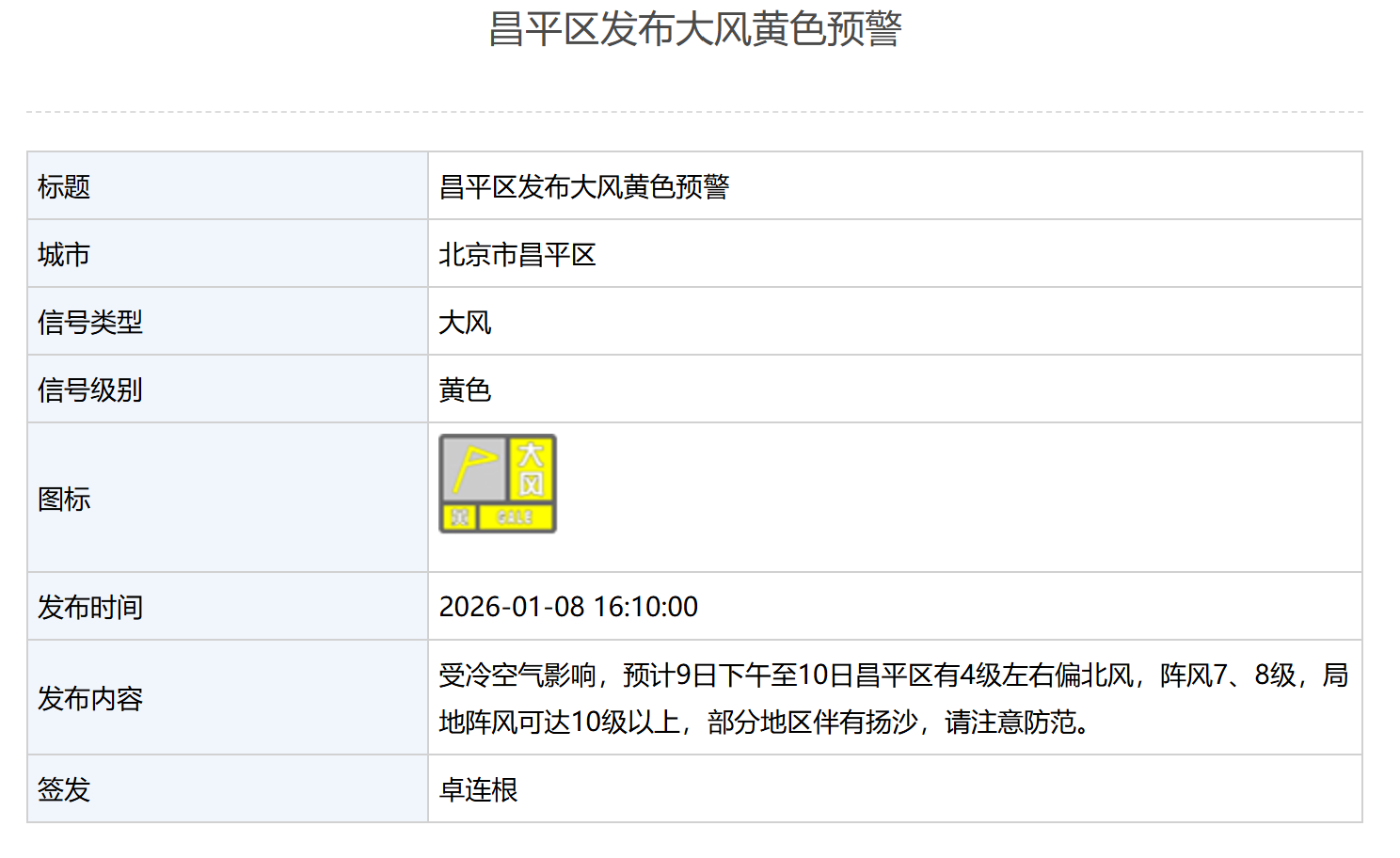 昌平区发布大风黄色预警:受冷空气影响,预计9日下午至10日昌平区有4级左右偏北风,阵风7、8级,局地阵风可达10级以上,部分地区伴有扬沙,请注意防范。