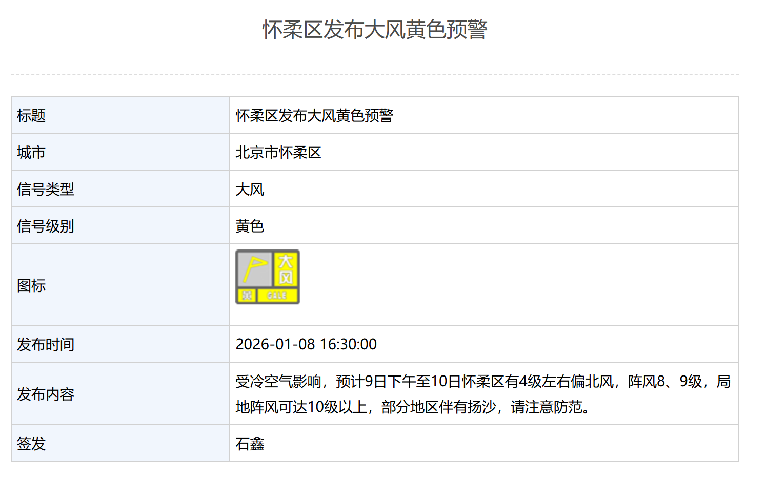 怀柔区发布大风黄色预警:受冷空气影响,预计9日下午至10日怀柔区有4级左右偏北风,阵风8、9级,局地阵风可达10级以上,部分地区伴有扬沙,请注意防范。