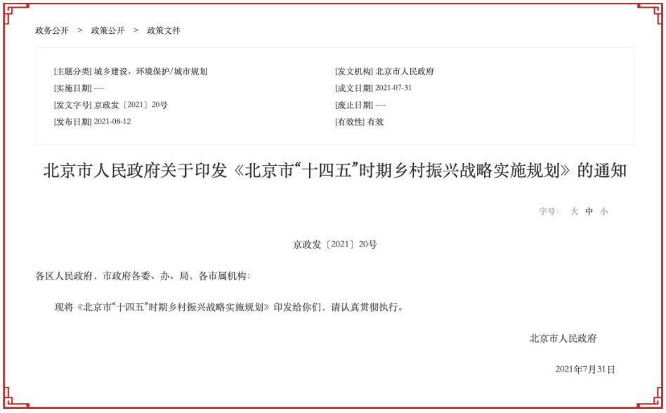 《北京市“十四五”时期乡村振兴战略实施规划》近日印发。到2025年,本市蔬菜自给率将提升至20%以上,实现猪肉自给率达10%,并将加快环京4小时粮食物流圈建设。