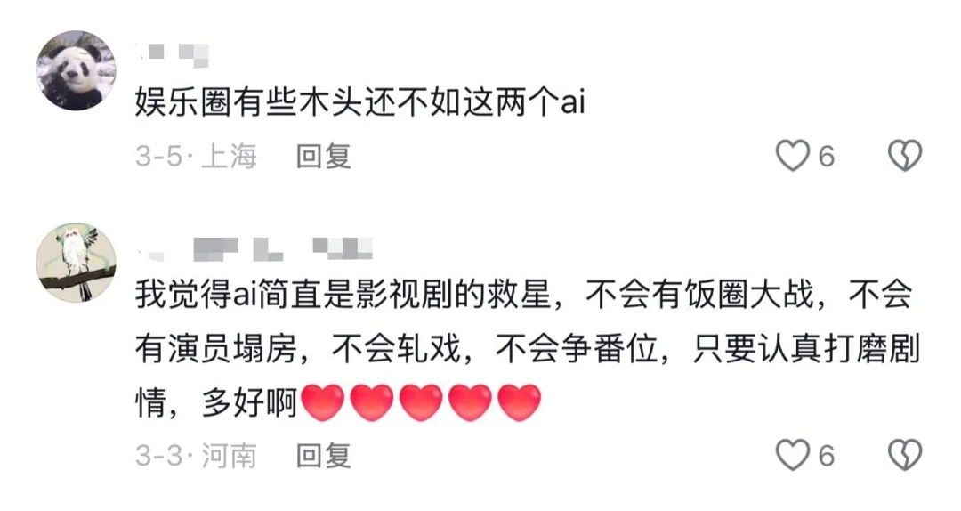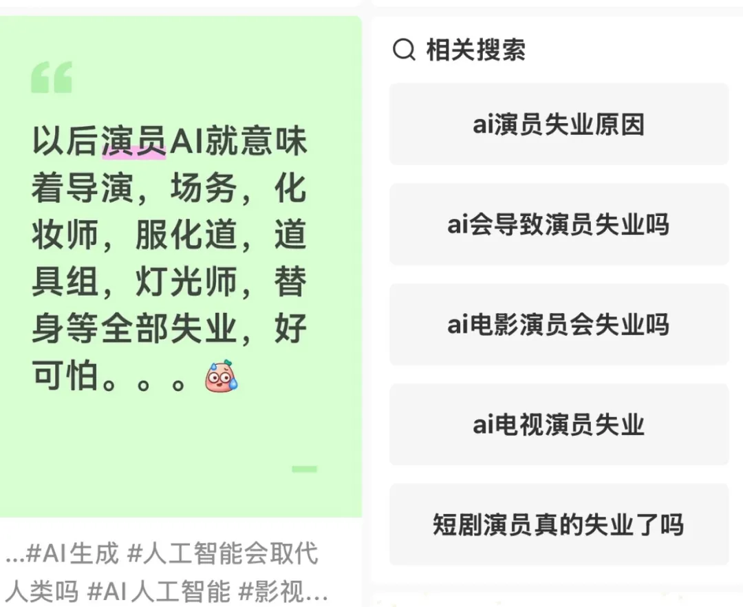 两位AI演员出道那天,“男二以下都用 AI” ,这条传闻,冲上热搜第一,小红书的焦虑帖子一夜之间多了起来。
