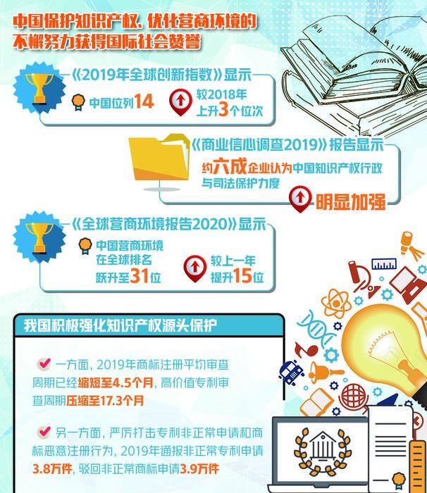 中国保护知识产权、优化营商环境的不懈努力获得国际社会赞誉。世界知识产权组织发布《2019年全球创新指数》显示,中国位列14,较2018年上升3个位次。中国欧盟商会发布的2019年度《商业信心调查》报告显示,约六成企业认为中国知识产权行政与司法保护力度明显加强。
