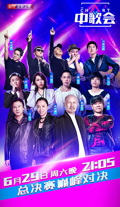 6月29日(周六)21:05,北京卫视《中歌会》总决赛巅峰之战即将拉开帷幕,这是一场原创音乐的激情对战,打榜歌手腾格尔、赵传、黄绮珊、马条、戴荃、金池、许飞、张玮、阿里郎组合、玛丽兄弟已进入紧张备战环节,究竟谁将问鼎中歌榜榜首之位?