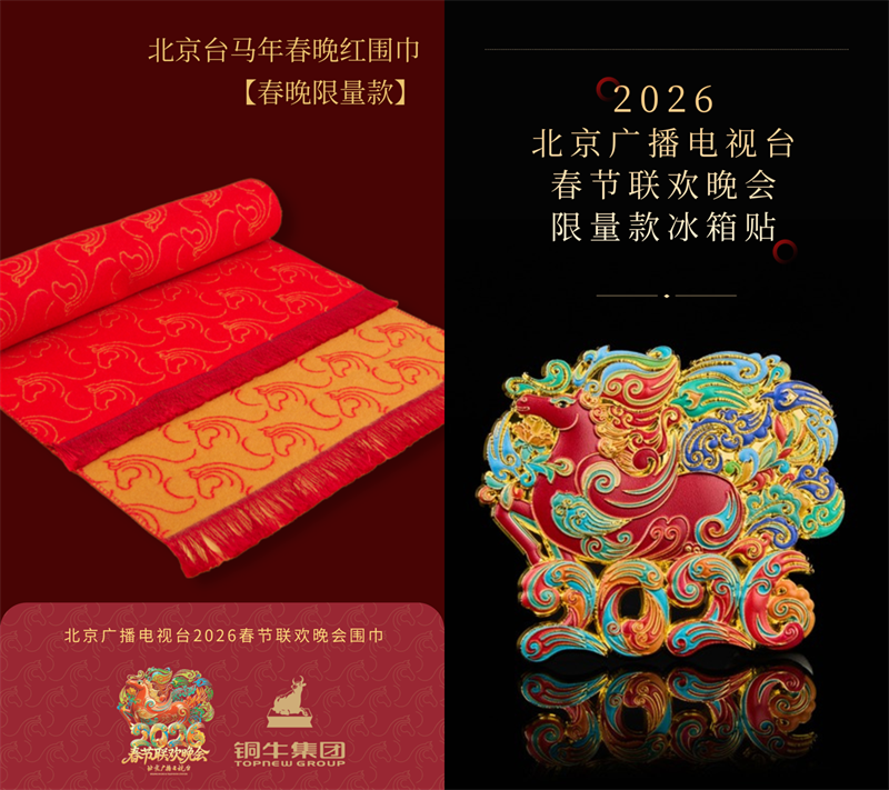 2026年北京台春晚联手老字号企业铜牛集团将春节温情与实用主义完美融合。以玉雕和景泰蓝两项国家级非遗的文化传承为底蕴,邀请中国工艺美术大师杨根连、北京工艺美术大师张旭、张颖进行设计,以时尚视角独到解构东方神韵,打造2026北京台马年春晚限定围巾与系列冰箱贴,让千年祥瑞以当代姿态走进寻常生活,传承匠人精神与东方时尚。