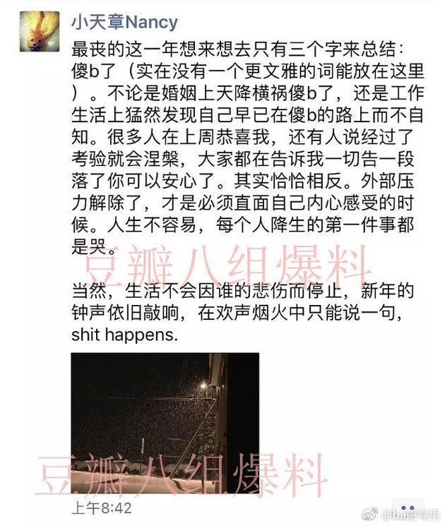 有网友爆料晒出疑似奶茶妹妹章泽天的朋友圈,其总结过去一年,称婚姻、工作生活都更没有文雅的词可以总结了,疑似回应刘强东一事。当然,生活不会因谁的悲伤而停止,新年的钟声依旧敲响,在欢声烟火中只能说一句,shit happens。