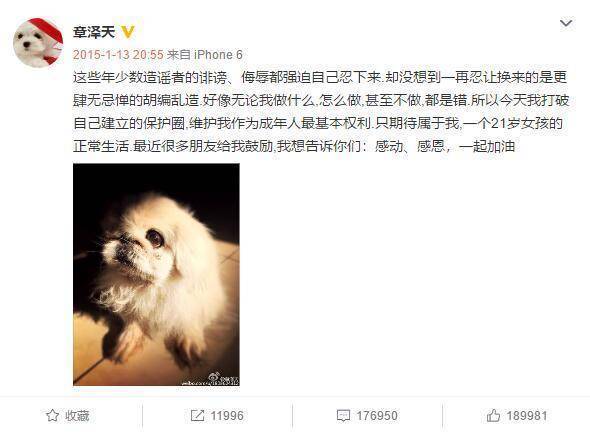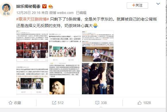 近日,有网友发现奶茶妹妹章泽天突然大量删博,只剩下5条内容。除去4条宣传向博文外,剩下的1条是关于2015年发博称遭受网友造谣诽谤将要维权的内容。