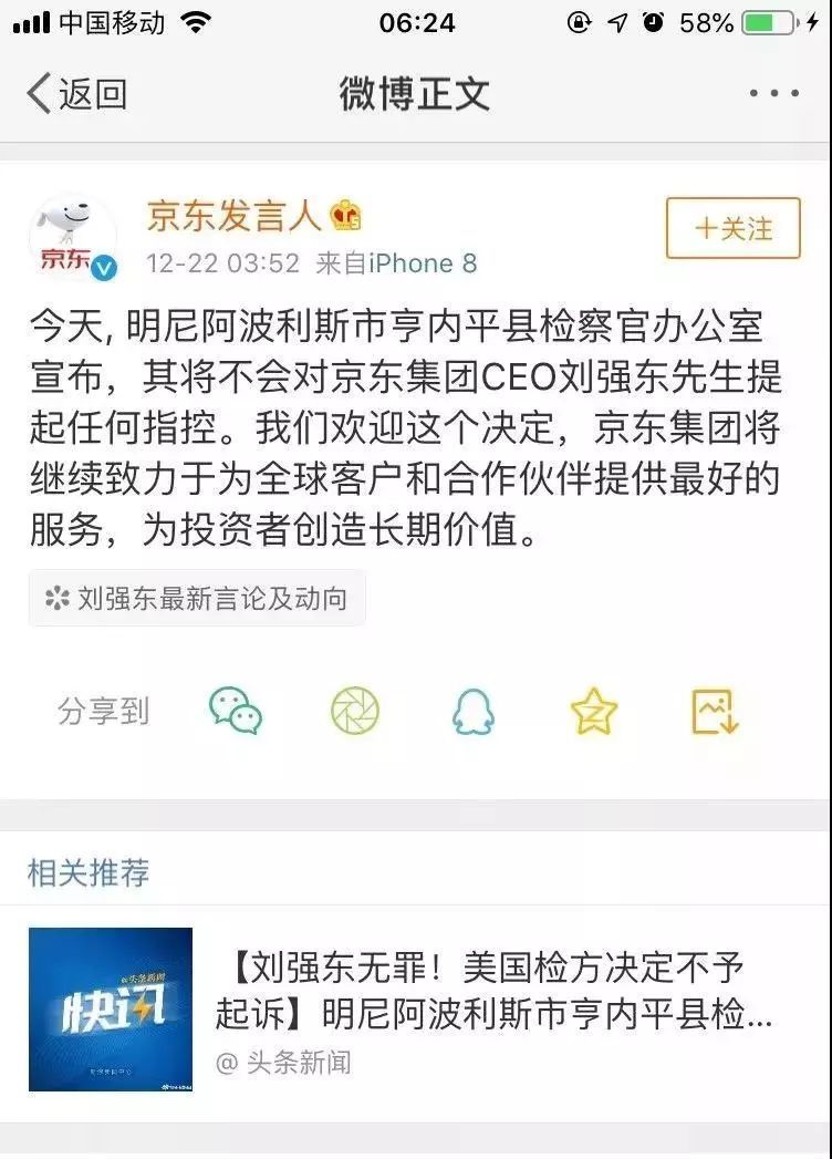 北京时间12月22日凌晨,明尼阿波利斯市亨内平县检察官办公室今日公布刘强东事件的调查结果,决定不予起诉,这也意味着该案正式结案,刘强东无罪。