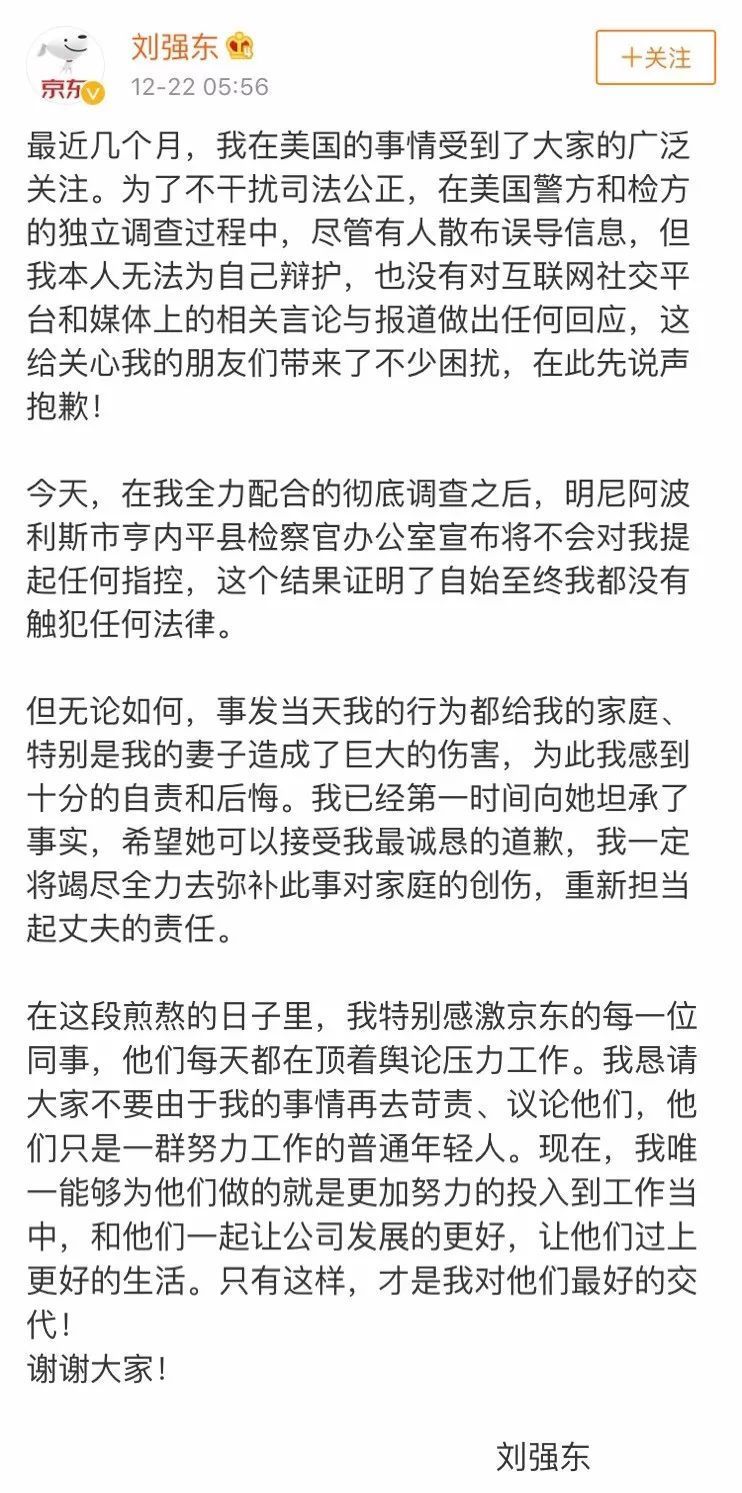 美国检方决定不予起诉 刘强东致歉:给妻子造成巨大伤害