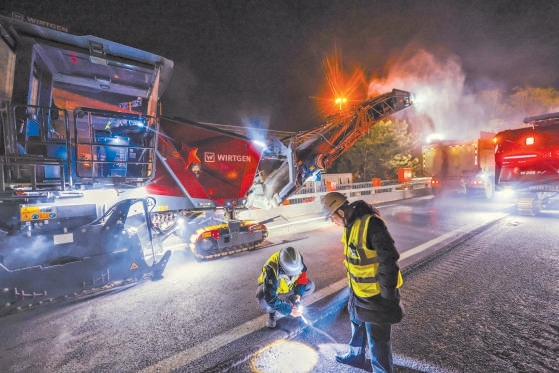 施工采用“整体铣刨沥青面层,整体破拆旧铺装,整体浇筑新铺装,整体铺设防水层”的施工组织模式,大面积整桥同步作业,确保施工质量和安全性能,实现效果最优。各阶段将高效调配人力物力,平均每阶段工程投入机械设备303台(套)、施工人员375人次,可完成3326平方米桥面混凝土铺装层翻新。