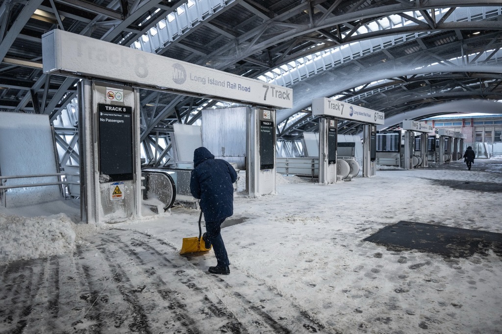 2月23日,美国纽约皇后区,长岛铁路系统因暴风雪关闭,工人在站台上清理积雪。视觉中国 图