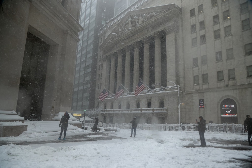 2月23日,美国纽约,市民在纽约证券交易所前通勤。视觉中国 图
