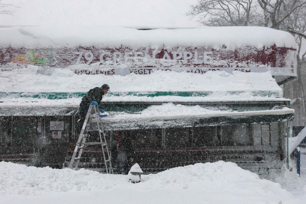 2月23日,美国纽约,市民在暴雪中清理杂货店招牌上的积雪。视觉中国 图