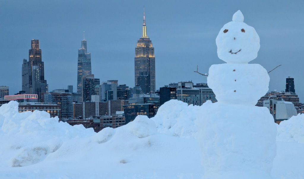 2月23日,美国新泽西州霍博肯,一场暴风雪过后,一个雪人立在公园中,背景是纽约市曼哈顿中城天际线和帝国大厦。视觉中国 图