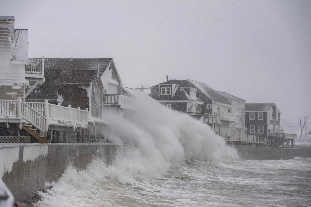 2月23日,在美国马萨诸塞州锡楚埃特的暴雪中,巨浪冲击着岸边的房屋。新华社 图