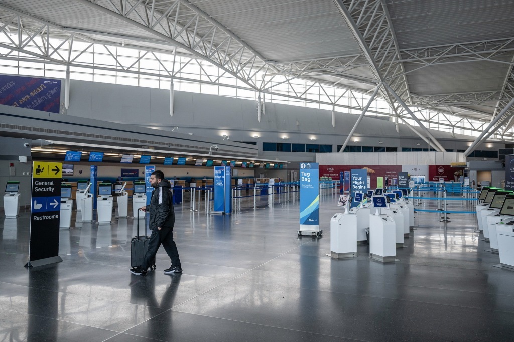 2月23日,美国纽约,一名旅客在约翰·肯尼迪国际机场8号航站楼几乎空无一人的出发大厅。视觉中国 图