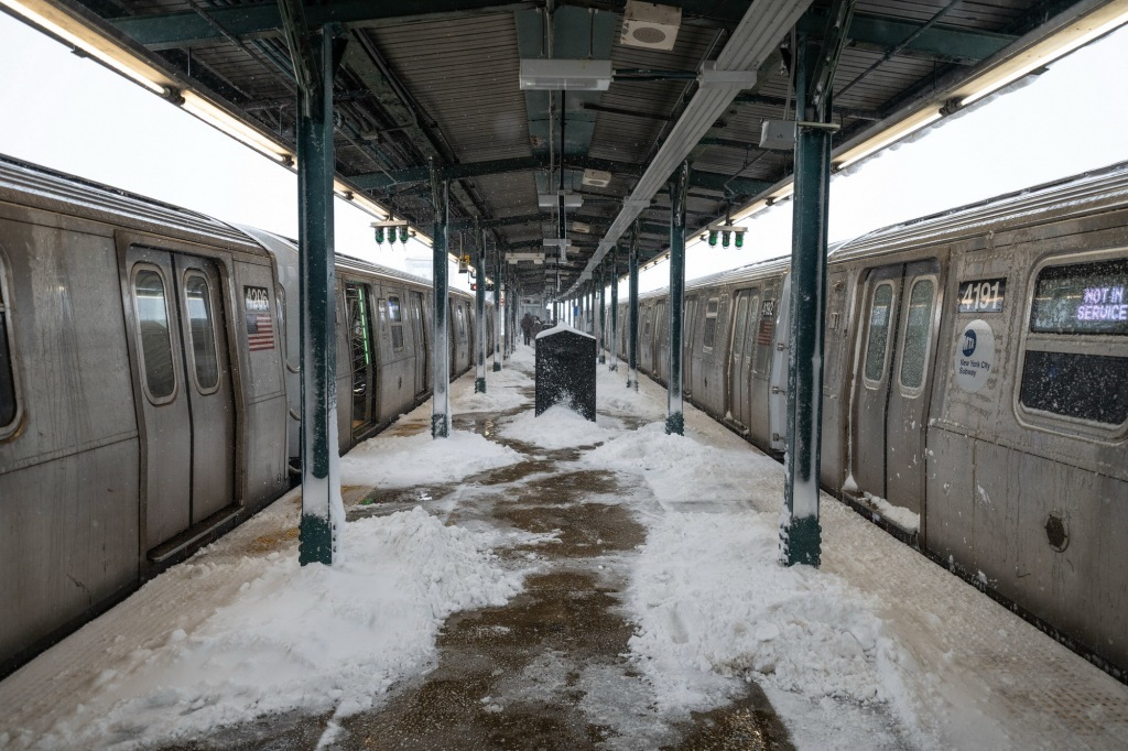 2月23日,美国纽约皇后区,停运的列车停靠在地铁站台。视觉中国 图