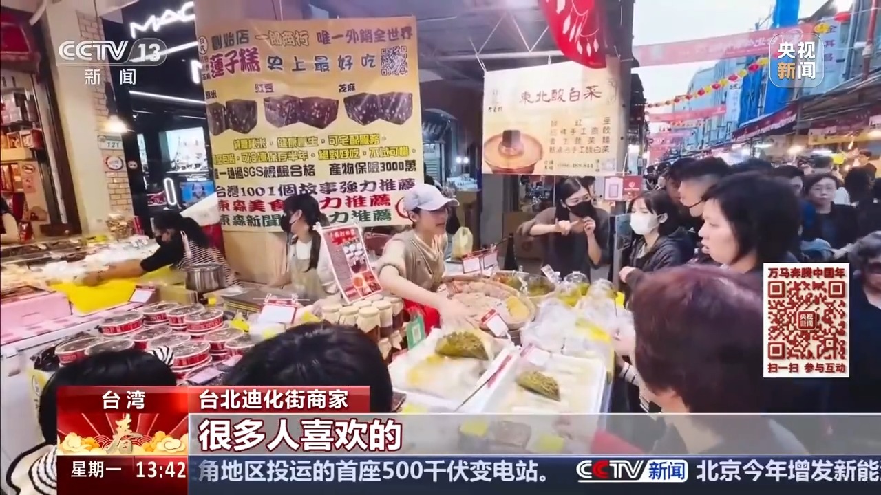 总台央视记者 黄达:俗话说,过了腊八就是年。在台湾尤其如此。要说腊月,台湾年味最浓的地方之一,就要数年货市场了。买年货,当地人有个说法,叫“北迪化,南三凤”,我现在就在台北迪化街年货大街,从我身后买年货的人潮,大家就可以感受到,这里不愧是当地人心目中台湾北部最著名的年货市场之一。