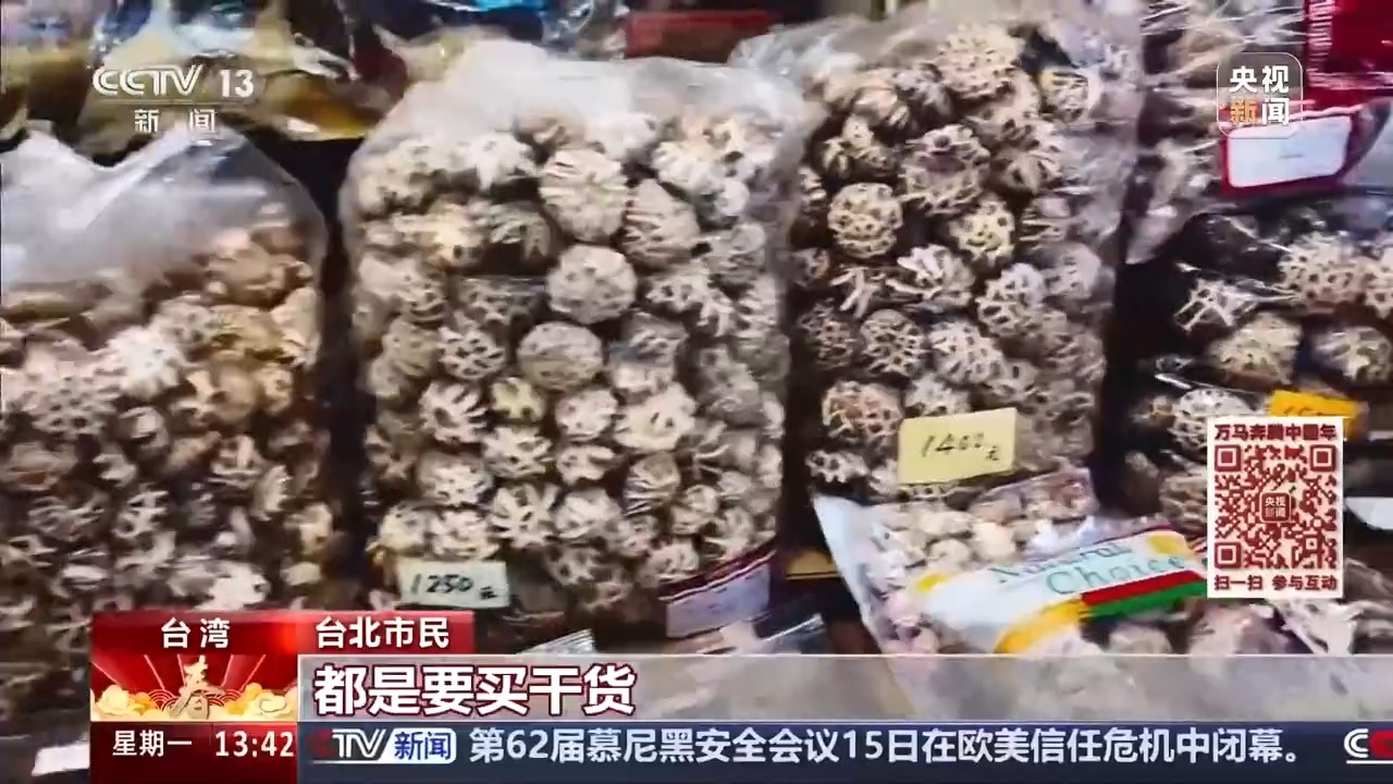 台北市民:我们台湾人每年过年都是要买干货,回去自己再炖、蒸、发。大陆现在过年也是很高高兴兴这样买年货,我们中华民族的生活还是继承几千年下来的生活情结。