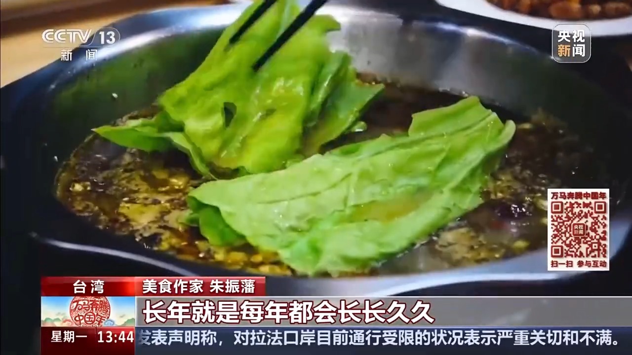 美食作家 朱振藩:芥菜又叫作长年菜,长年也就是每年都会长长久久。过年时候台湾也必须吃鱼,表示年年有余,食物中融入美好的寓意,是中华传统文化的体现。两岸文化氛围是紧紧相扣,割舍不离。