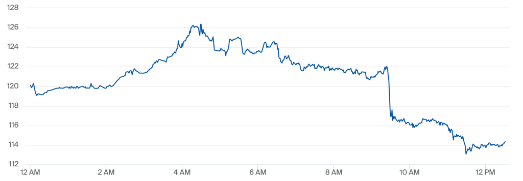 短短数小时后,上述涨幅全部回吐,油价急转直下。截至发稿,布伦特和WTI原油期货分别报114.05美元/桶、104.57美元/桶,日内下跌3.37%和2.16%。
