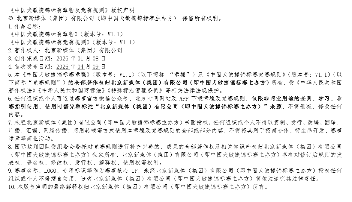 《中国犬敏捷锦标赛章程》及《竞赛规则》全文可通过北京时间官方网站及APP下载查阅。本章程与规则的知识产权归赛事主办方所有,未经授权不得擅自修改、转载、商用。