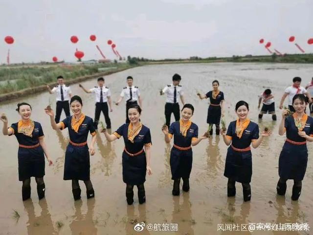 但接下来的一组图片却让人惊呆——在稻田插秧体验环节,身着靓丽制服的青航空姐空少亲自下地插秧了。