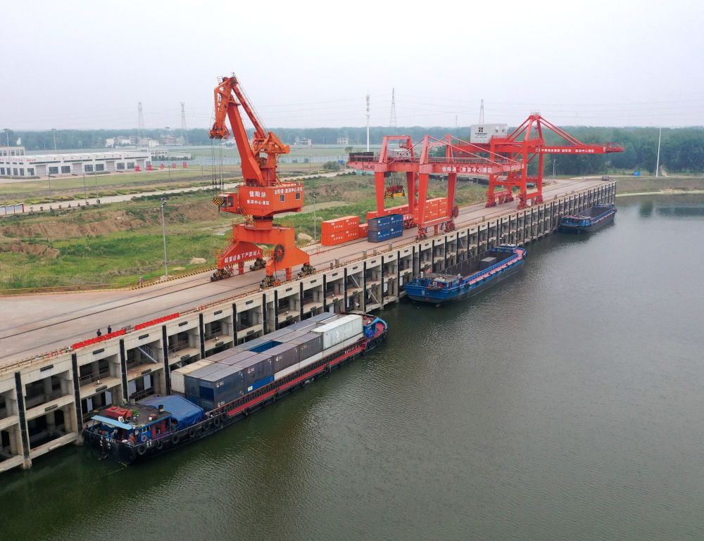 2024年6月5日,货船停泊在信阳港·淮滨中心港内(无人机照片)。