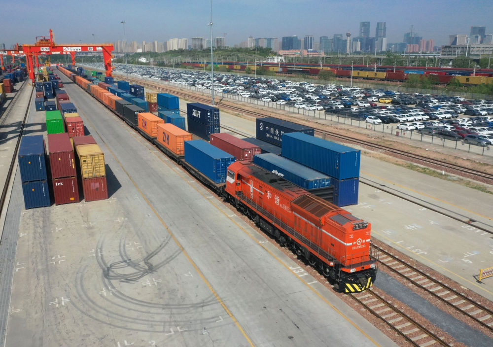 2025年4月15日,X8003次中欧班列(郑州)停靠在国铁集团郑州局圃田车站(无人机照片)。