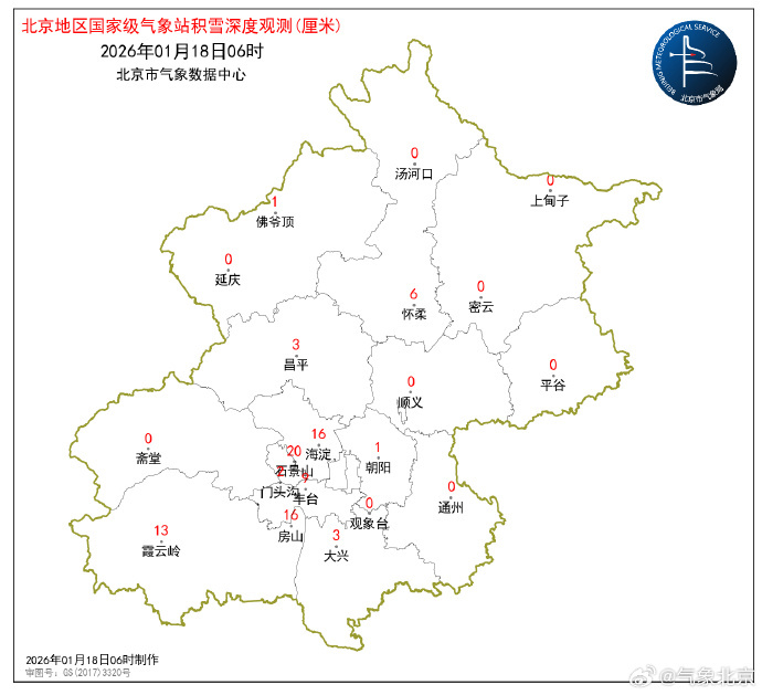 17日06时至18日06时,全市平均降雪量为1.2毫米,城区平均1.5毫米,最大降雪量出现在丰台千灵山9.9毫米。