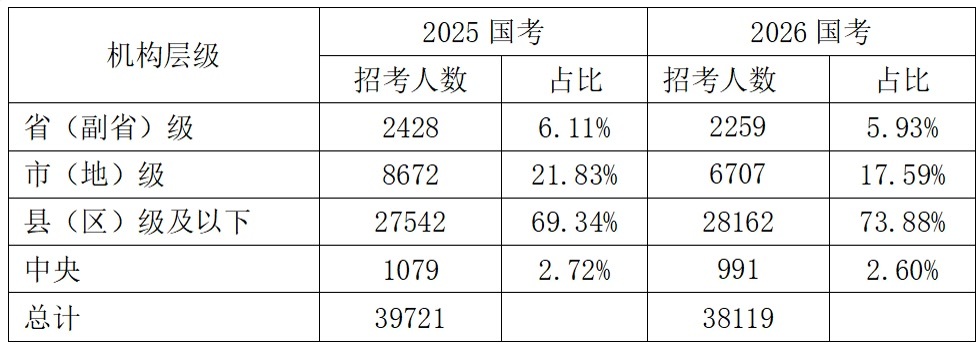 2026国考坚持充实和稳定基层力量,录用政策、录用计划向基层一线倾斜,本次国考近2.81万个计划补充到县(区)级及以下直属机构,占总人数的73.88%,比去年提升了4个百分点。县级以下职位主要集中于一线基层岗位,条件相对艰苦,艰苦边远地区基层机关职位结合实际采取了降低学历要求、放宽专业条件、不限制工作年限和经历等措施降低进入门槛,并在划定笔试合格分数线时进一步予以政策倾斜。多措并举鼓励引导人才向基层一线流动,进一步充实基层公务员队伍。