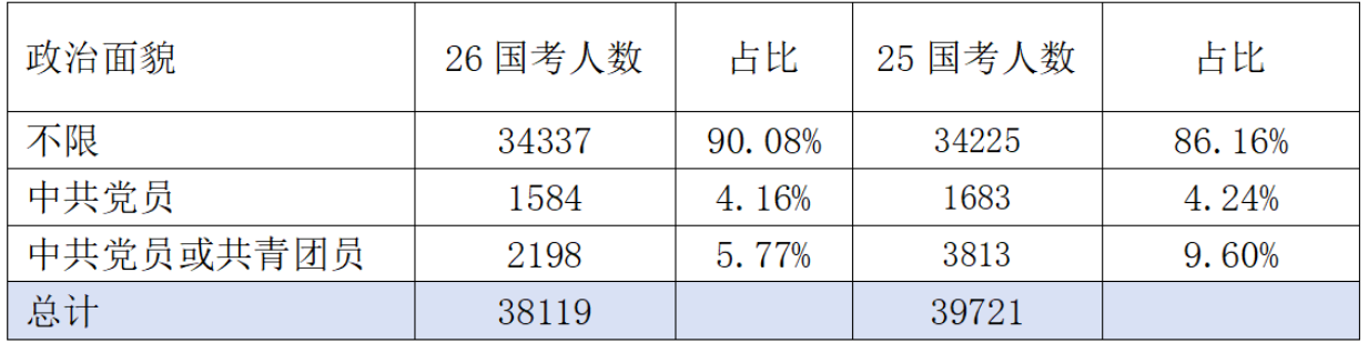 2026 国考不限政治面貌招录人数达34337人,较2025年增加112人,占比从 86.16%升至90.08%。这一变化与国考强化基层导向相呼应,县(区)级及以下基层岗位占比超七成,多放宽政治面貌限制。同时,虽政治考察常态化,但普通岗位降低门槛,进一步扩大选人视野,提升招录公平性,为“群众”提供更多机遇。