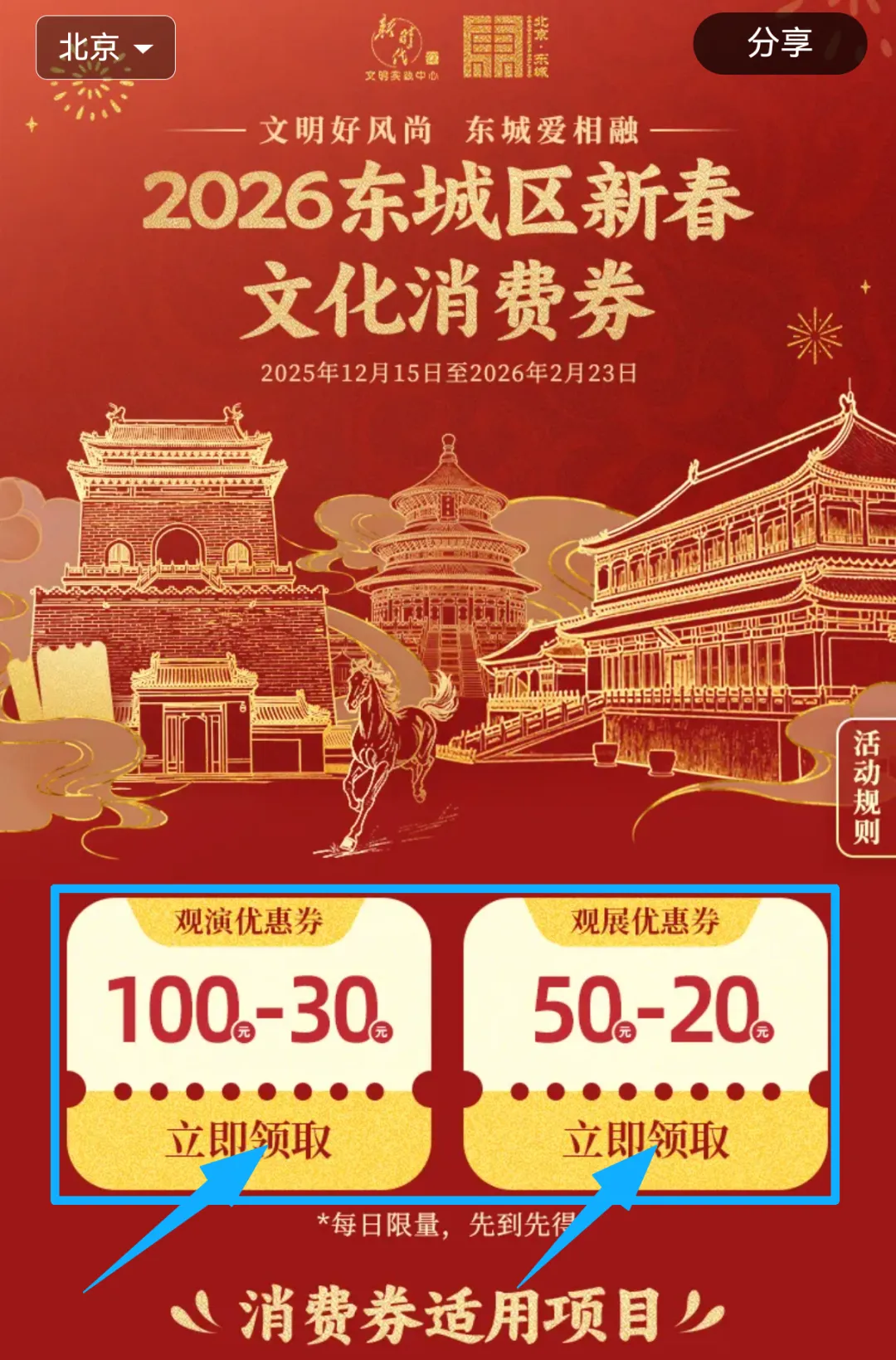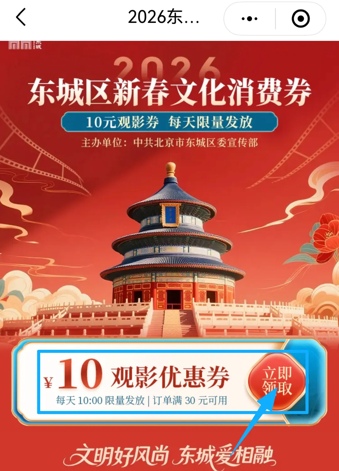 岁末年初,东城文化焕发新彩。文化消费券不仅是一份实在的惠民补贴,更是一张饱含温度的文化邀约,诚邀广大市民走进影院、剧场、展馆、书店,在浓郁的年节氛围中,品味中轴气韵、古都风貌与时代创意的交融共鸣,共同珍藏属于这座城市的文化印记。