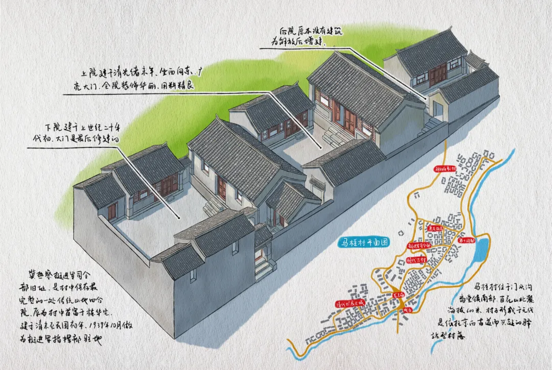 我们从斋堂下了京蔚高速,向南拐进山口,西侧是双峰山、东侧是猴山,马栏村就坐落在四面环山的小盆地中,山间林木茂盛,泉水在村前汇成一道溪流。我们将车停在龙王庙前的小广场上,这里现在是村子中心,村落由此分为两部分。西南侧地势狭窄,院落窄小,沿小溪两岸呈线性布局,西北侧是开阔的台地,房屋呈环状等高线布局。