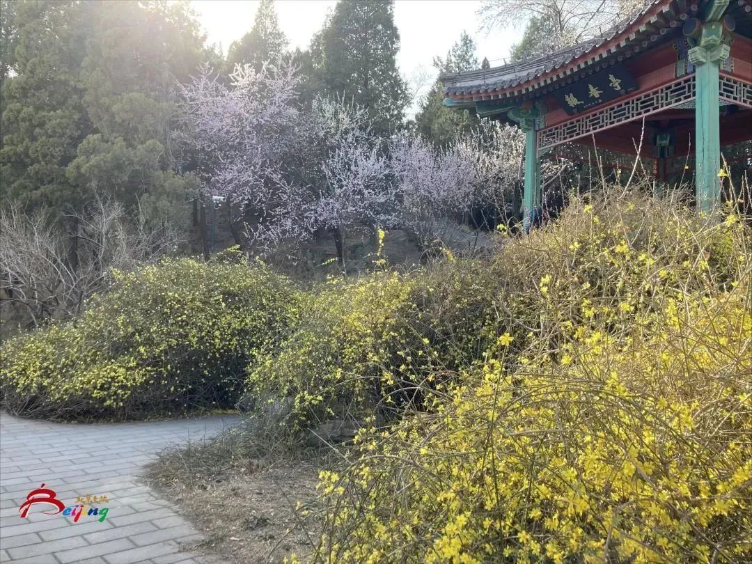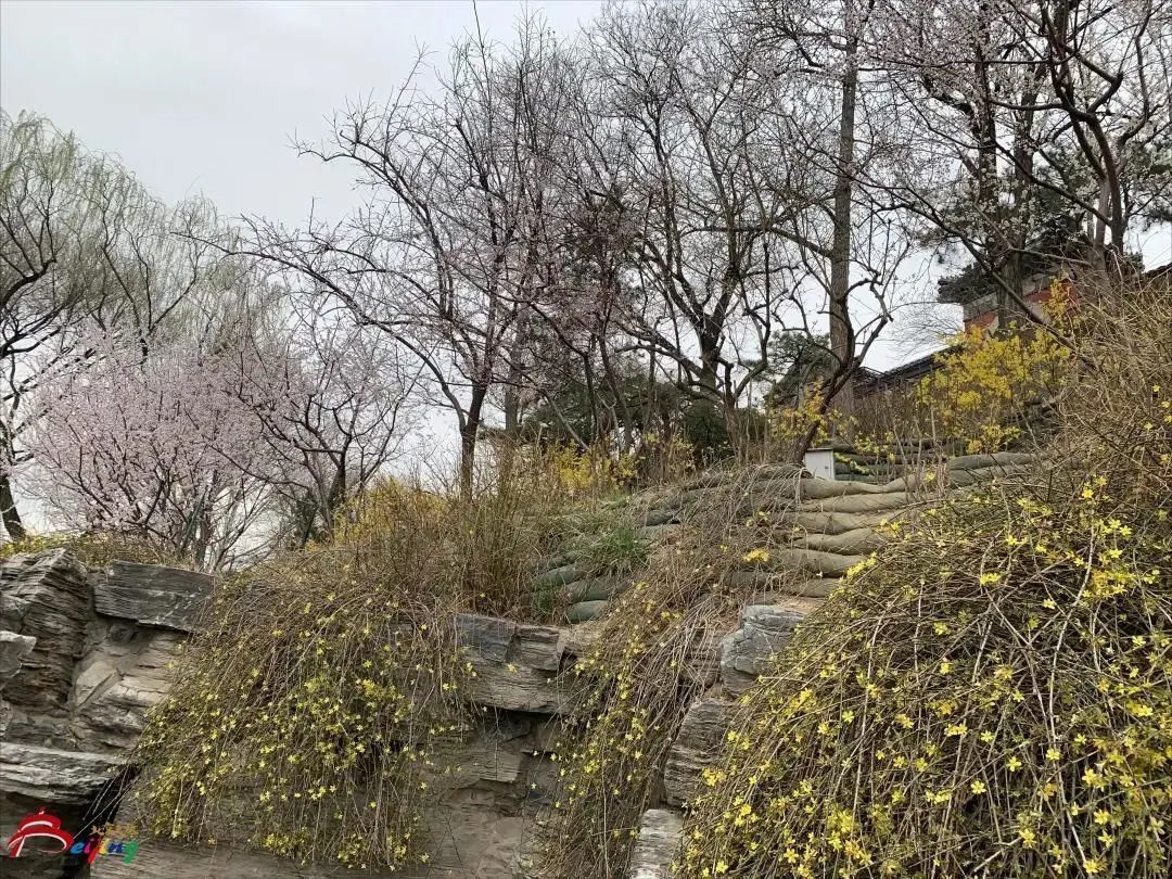 此时山桃与迎春一起绽放,在松柏等常绿树的映衬下,桃红似霞,金黄点点,营造出一幅春意盎然的美好画卷。