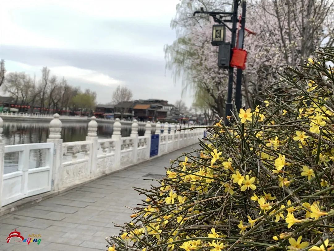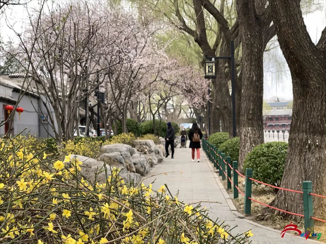 随着气温升高,京城街头春色渐浓。什刹海畔柳条渐绿,迎春花、桃花初开,市民游客穿行其间,感受初春美景。