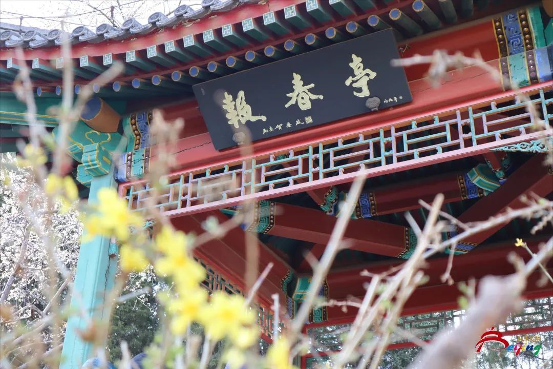 陶然亭公园内的报春亭,在公园东北角的山脚下,亭为四角攒尖顶,亭脊微曲,四角缓缓向上翘起,造型舒展大方。亭旁配置松、石,广栽迎春,每年冬去春来,迎春花开,春意盎然,生机无限。