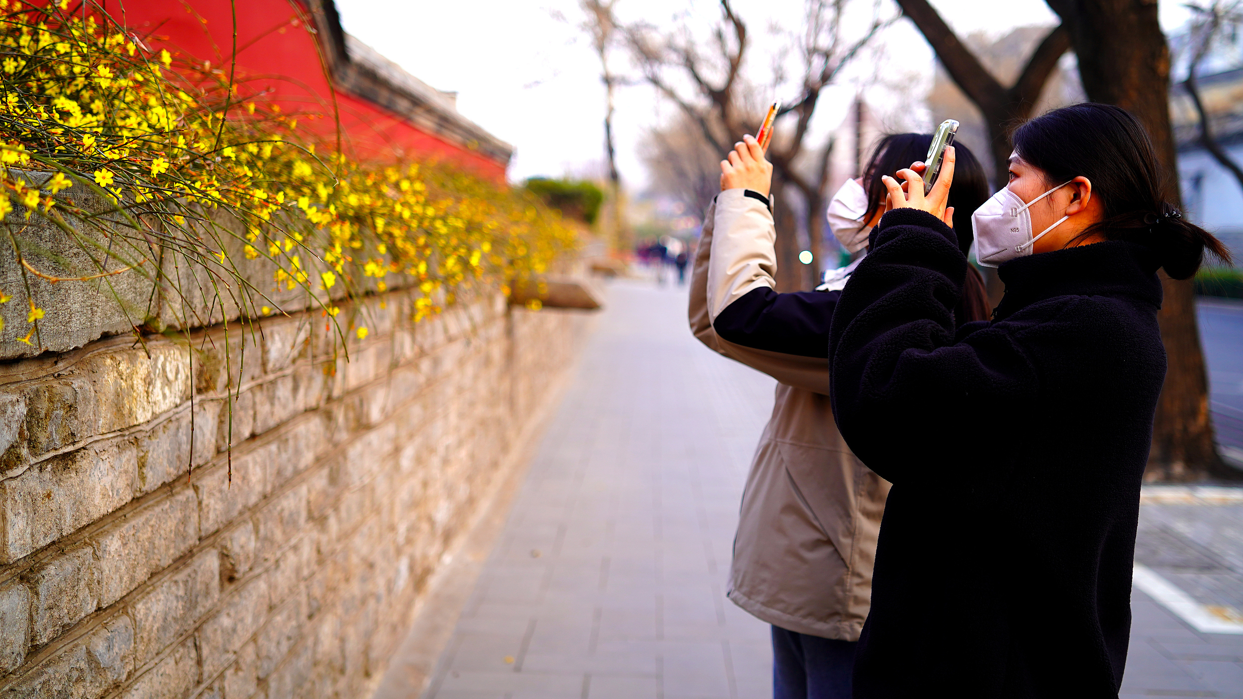 随着气温回升,位于鼓楼西大街边的迎春花也次第开放,向人们传递着春天的气息。走在红墙下邂逅这一抹亮色,任谁都会拿出手机拍下美景吧。
