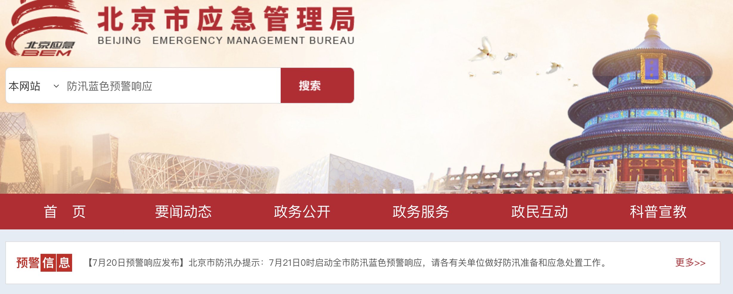 北京市防汛办提示:7月21日0时启动全市防汛蓝色预警响应,请各有关单位做好防汛准备和应急处置工作。
