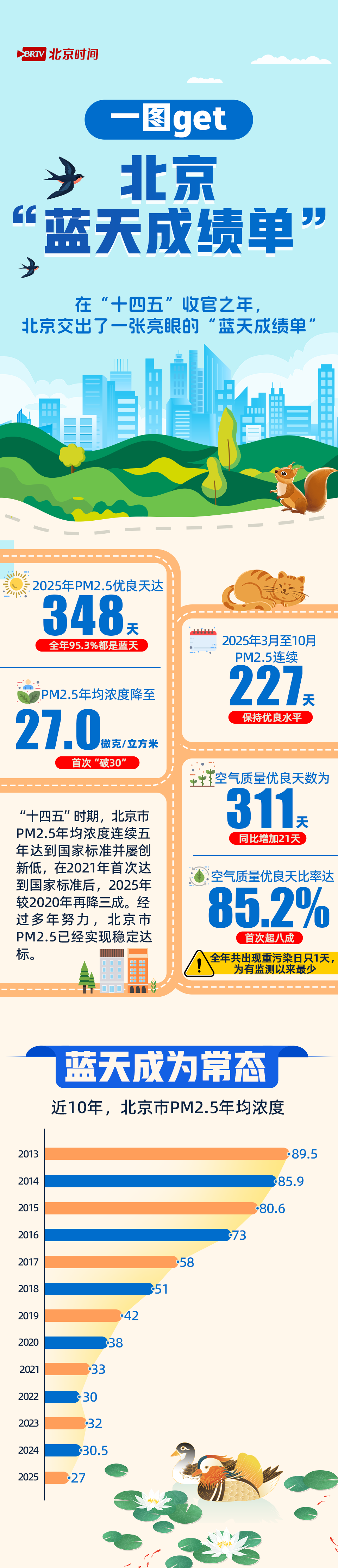 在“十四五”收官之年,北京交出了一张亮眼的“蓝天成绩单”:细颗粒物(PM2.5)年均浓度首次实现“破30”,为27.0微克/立方米;空气质量优良天比率首次超八成,达到85.2%;多项指标创有监测以来最优水平,空气质量实现全面达标。蓝天成为常态,北京市把人民对美好生活的向往作为奋斗目标,生动地书写在了蓝天上。