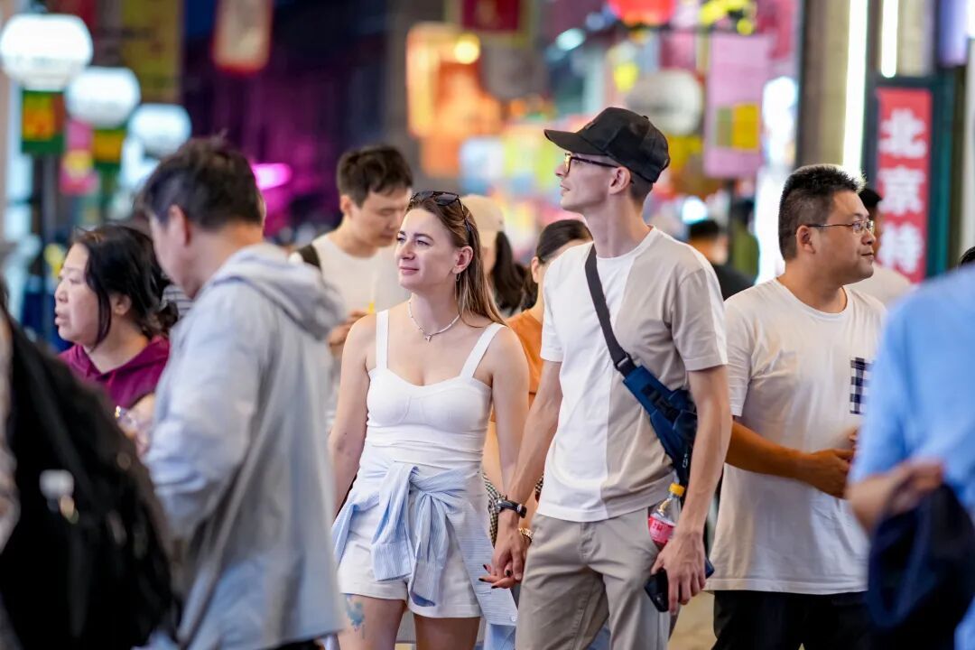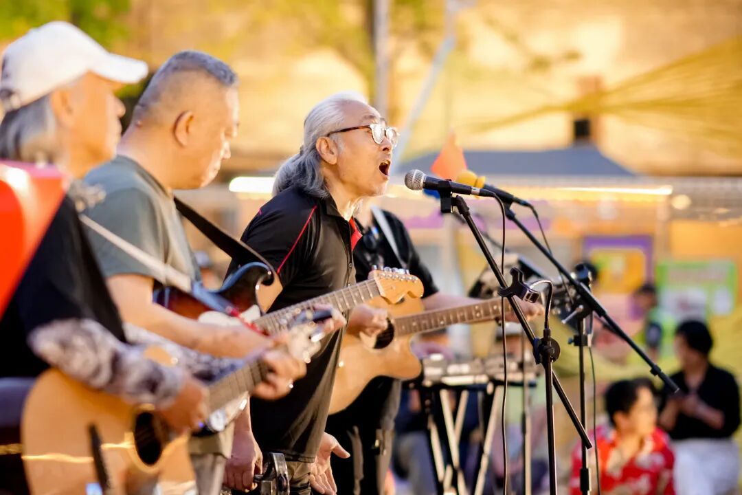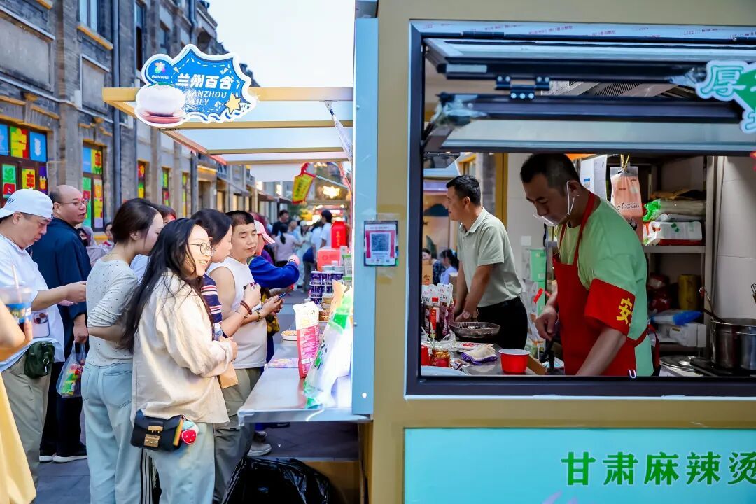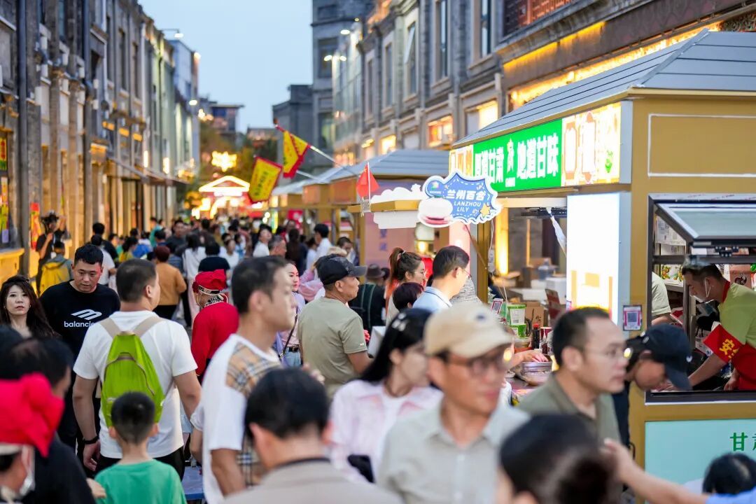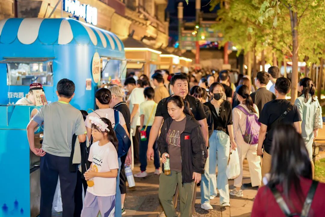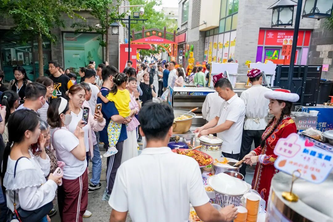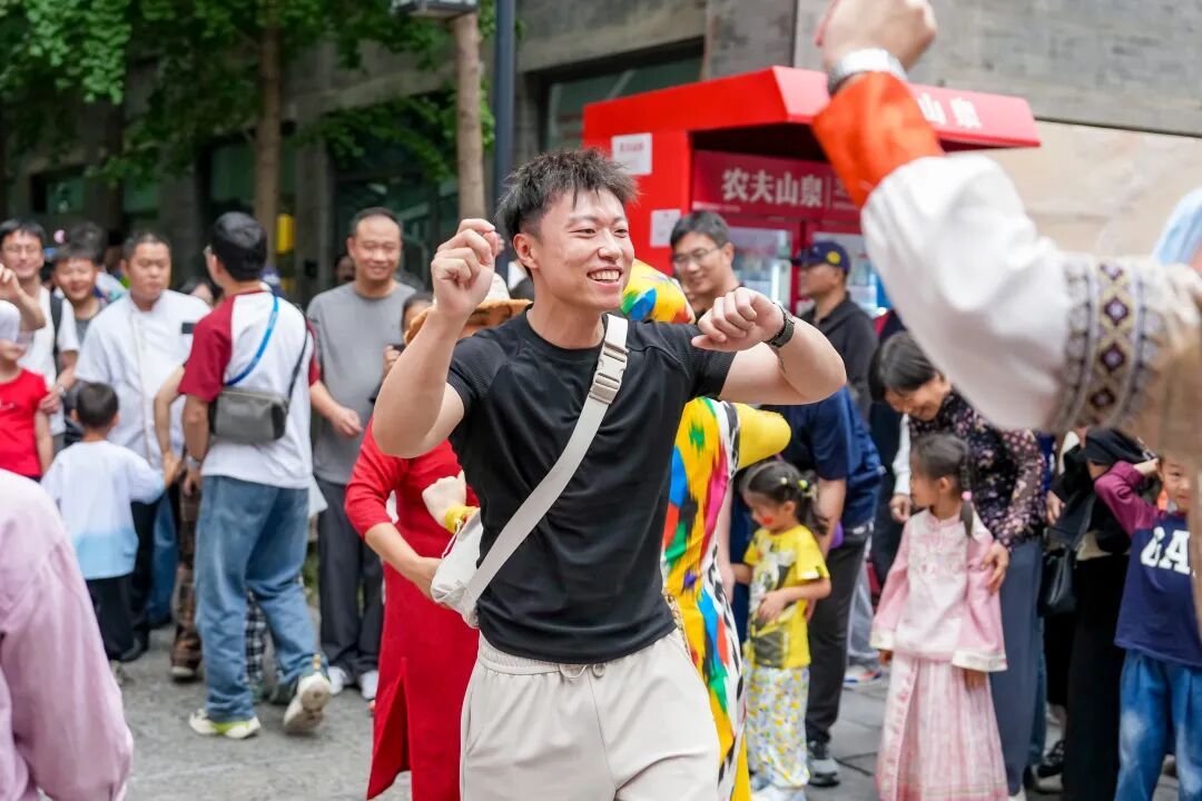 一到傍晚,氛围更热闹。民谣乐队驻场献唱,经典老歌与国风原创轮番上演。国风快闪巡游的演员身着传统服饰穿梭街巷,与游客即兴合影。甘肃、新疆等驻京办摊位还穿插着民族文艺表演,游客一边吃着特色美食,一边感受各地文化,“像在一条街上逛遍了全国”。