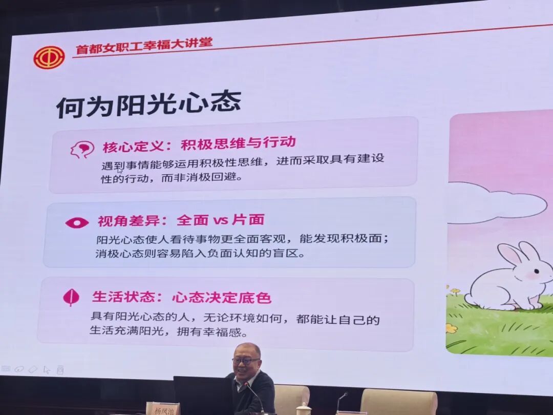 讲座紧扣机关女职工工作生活实际,围绕职场压力调适、角色平衡构建、阳光心态养成等重点内容,系统讲解心理韧性提升方法与实操技巧,引导女职工以积极健康的心态面对工作挑战、涵养身心健康。讲座同步开展线上直播,切实把党组织的关怀与温暖送到女职工心坎上,激励大家以更加强健的心理素质、更加昂扬的精神状态立足岗位、履职尽责。