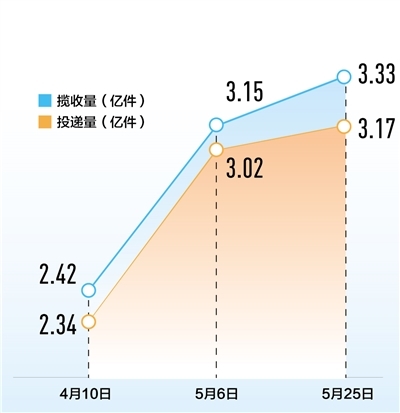 4月10日以来,各地各部门多措并举保通保畅,全国停运的邮政快递分拨中心和邮件快件积压数均大幅下降。5月6日,全国邮件快件揽收、投递量均恢复至3亿件以上;5月28日,邮件快件揽收量约为3.14亿件,投递量约为3.22亿件,均超过去年同期水平。