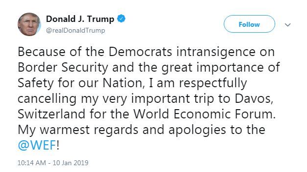 他在推特上写道:"由于民主党人对边境安全固执己见以及安全对我国意义重大,我慎重决定取消十分重要的达沃斯行程。"