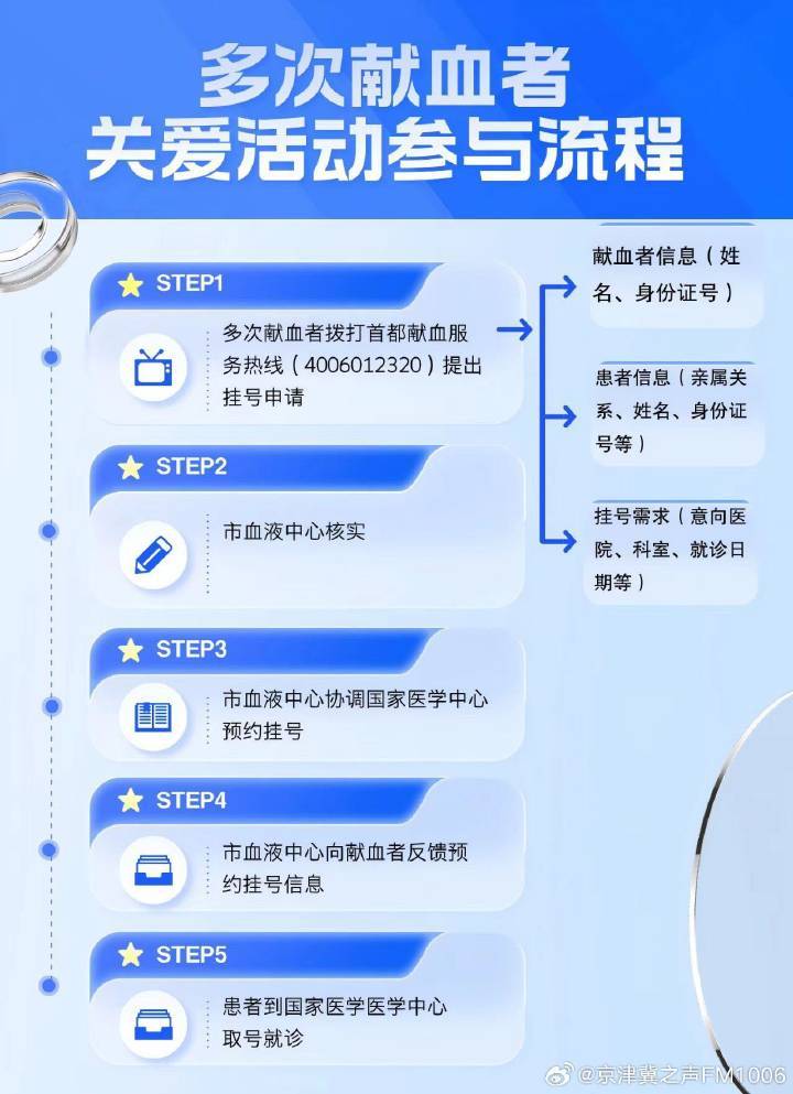 9月22日起,北京市红十字血液中心启动国家医学中心多次献血者关爱活动,为符合条件的多次献血者预约国家医学中心优势重点学科7日后的普通门诊号、专家门诊号、特需门诊号,提供优质医疗资源的绿色通道。该活动将持续至2027年8月31日。