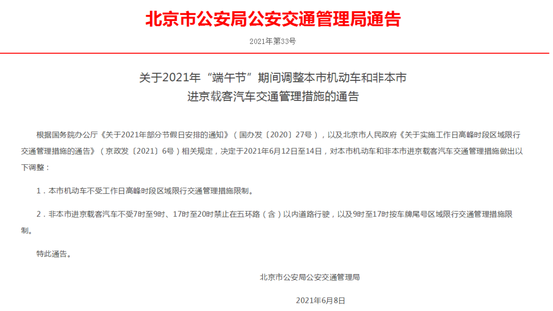 此外,2021年6月12日至14日,对本市机动车和非本市进京载客汽车交通管理措施做出以下调整: