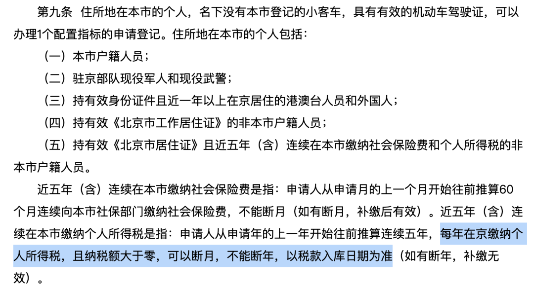 《<北京市小客车数量调控暂行规定>实施细则》(2020年修订)2021年1月1日起正式实施,其中规定,住所地在本市的个人,名下没有本市登记的小客车,具有有效的机动车驾驶证,可以办理1个配置指标的申请登记。持有效《北京市居住证》且近五年(含)连续在本市缴纳社会保险费和个人所得税的非本市户籍人员也具备资格。