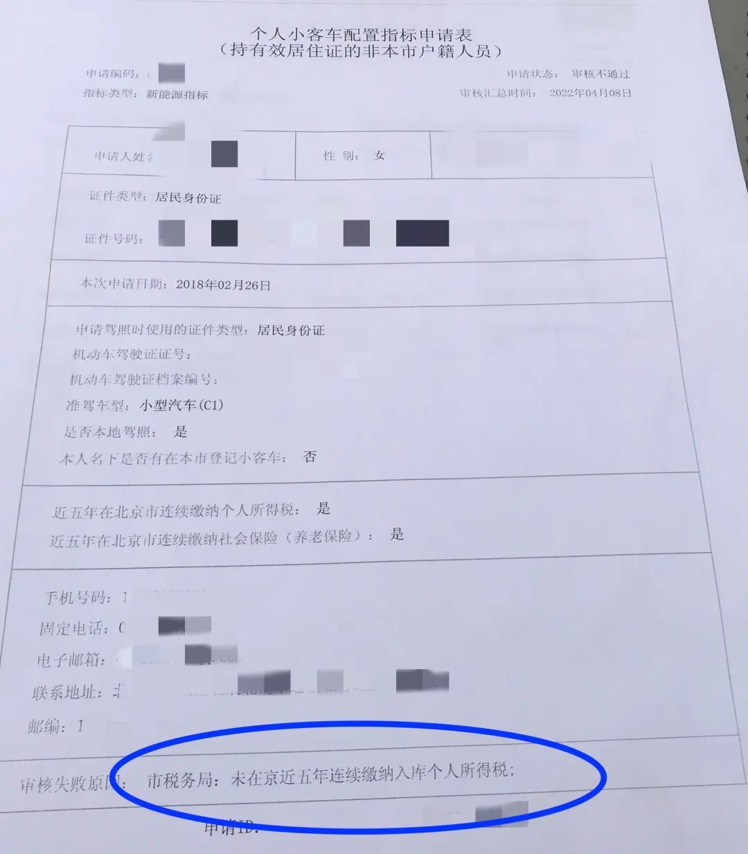 市民张女士从2014年起开始申请摇号,摇过几期油车指标后感觉中签“遥遥无期”,于是在2018年年初开始排新能源指标。结果今年4月8日资格审核结果显示不通过,原因就是没有连续五年缴纳入库个人所得税。